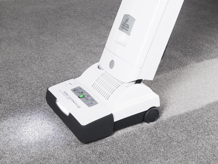 AUTOMATIC X models are the most technically advanced and uniquely easy-to-use vacuum cleaners in the world! Available in two power head widths, the 12-inch X7 and 15-inch X8 feature truly automatic height adjustment, an LED headlight, and an extra layer of micro-filtration. An electronic controller measures the resistance of the spinning brush roller against the floor surface and then signals up or down adjustments, to ensure optimal performance on both carpets and hard floors. The user is alerted to clogs, a worn brush, or a full bag, and the vacuum automatically shuts off when brush obstructions occur. The X7 and X8 also have an instant-use cleaning wand and suction hose, a lifetime belt warranty, tool-free brush roller removal, a 40-foot power cord, three on-board attachments, and excellent pet hair removal.